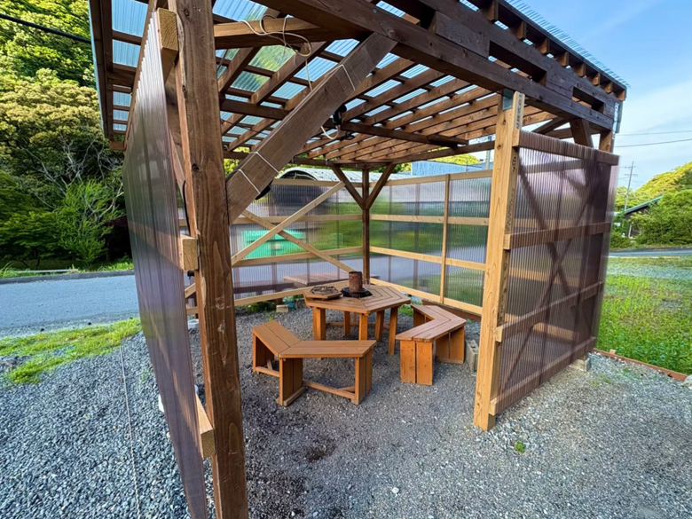 車で15分程度の距離に、スーパーや精肉店もあるので、買い出しの心配もいらない。バラエティ豊富なキャンプ用品を揃え、冬はストーブも設置。屋根や風よけが付いているので雨の日でも楽しめる、全天候型のバーベキュー設備。