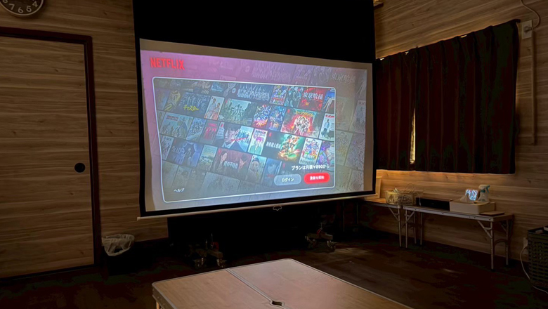 100インチプロジェクターで映画鑑賞,テレビゲームなど家族や友人と楽しめます。